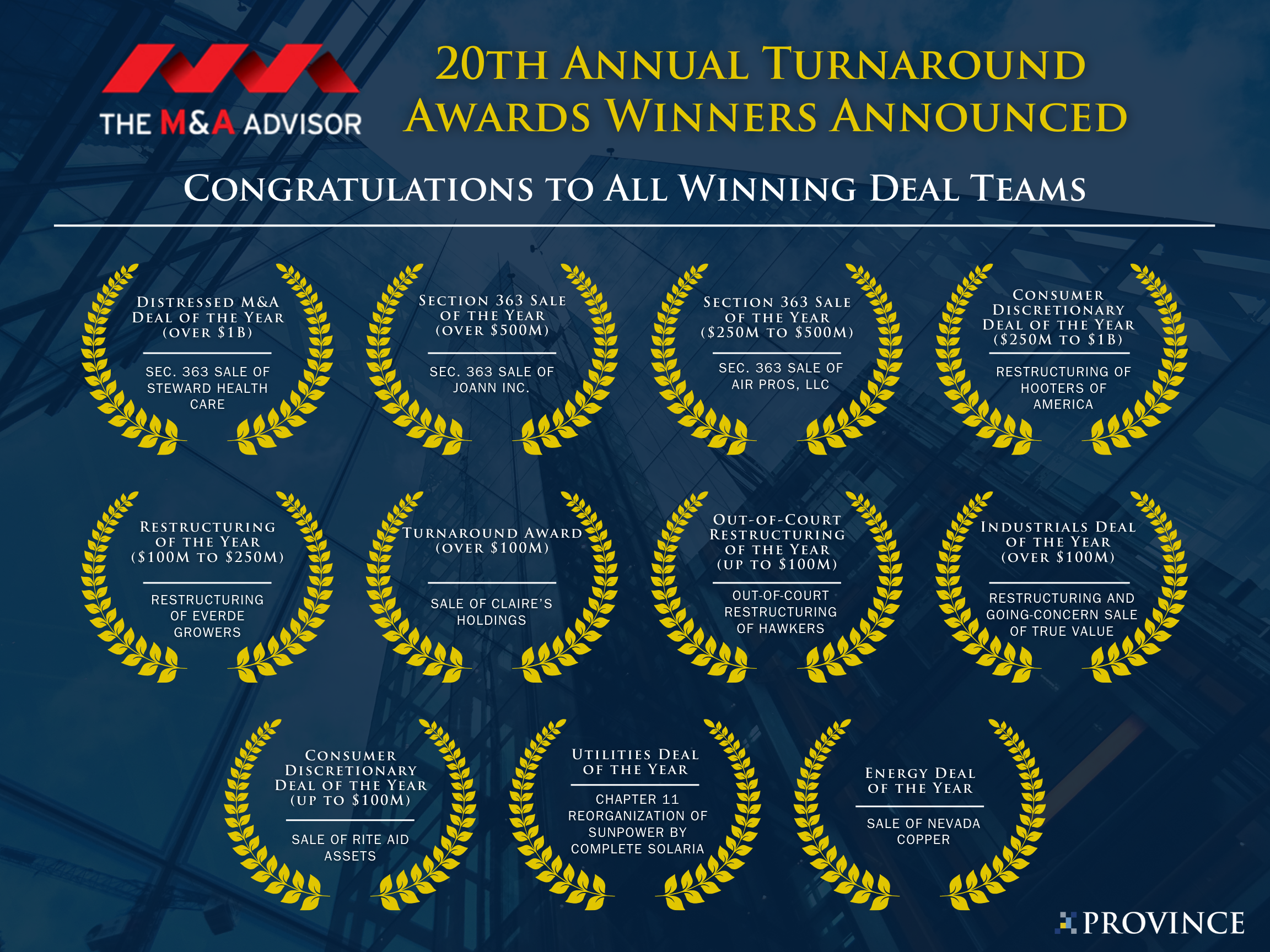 “Since 2002, The M&A Advisor has been honoring the leading turnaround transactions, companies and dealmakers. Province was chosen from hundreds of participating companies to receive these awards. It gives us great pleasure to recognize Province and recognize them with the highest of honors for distressed investing and restructuring firms and professionals,” said Roger Aguinaldo, Founder and CEO of The M&A Advisor.