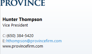 Prior to joining Province, Mr. Thompson began his career at Telos Advisors as an Investment Banking Analyst, where he played a pivotal role in preparing corporate carve outs and mergers and acquisitions targeting the lower middle market. As an undergraduate student at Washington University in St. Louis, Mr. Thompson gained considerable experience in consulting and financial accounting through case competitions and pro bono work for non-profits.
